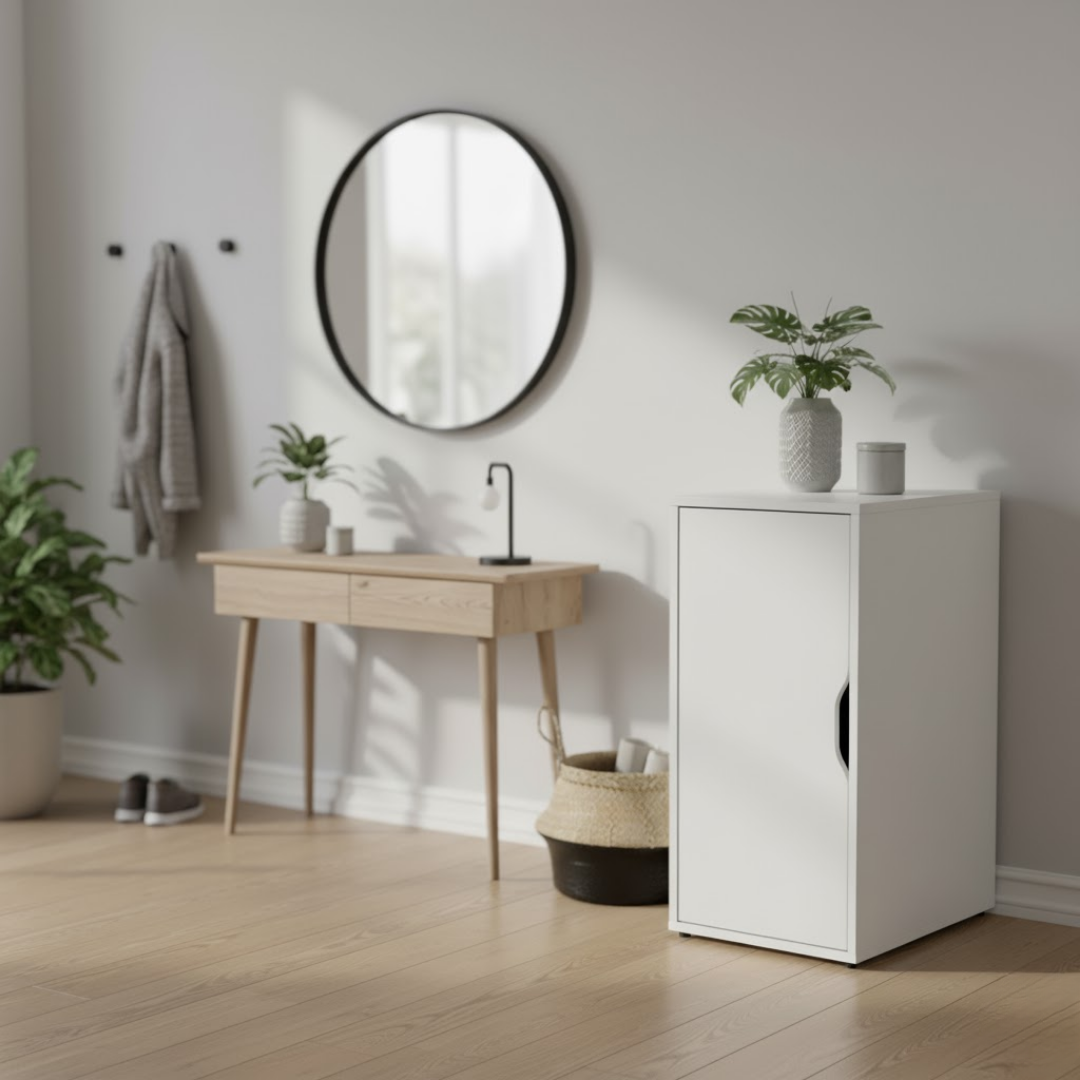 Koristite ga kao mali ormarić za hodnik, bočni ormarić, kompaktni ormarić za pohranu ili noćni ormarić s vratima. Idealan za minimalističko opremanje i maksimiziranje prostora.