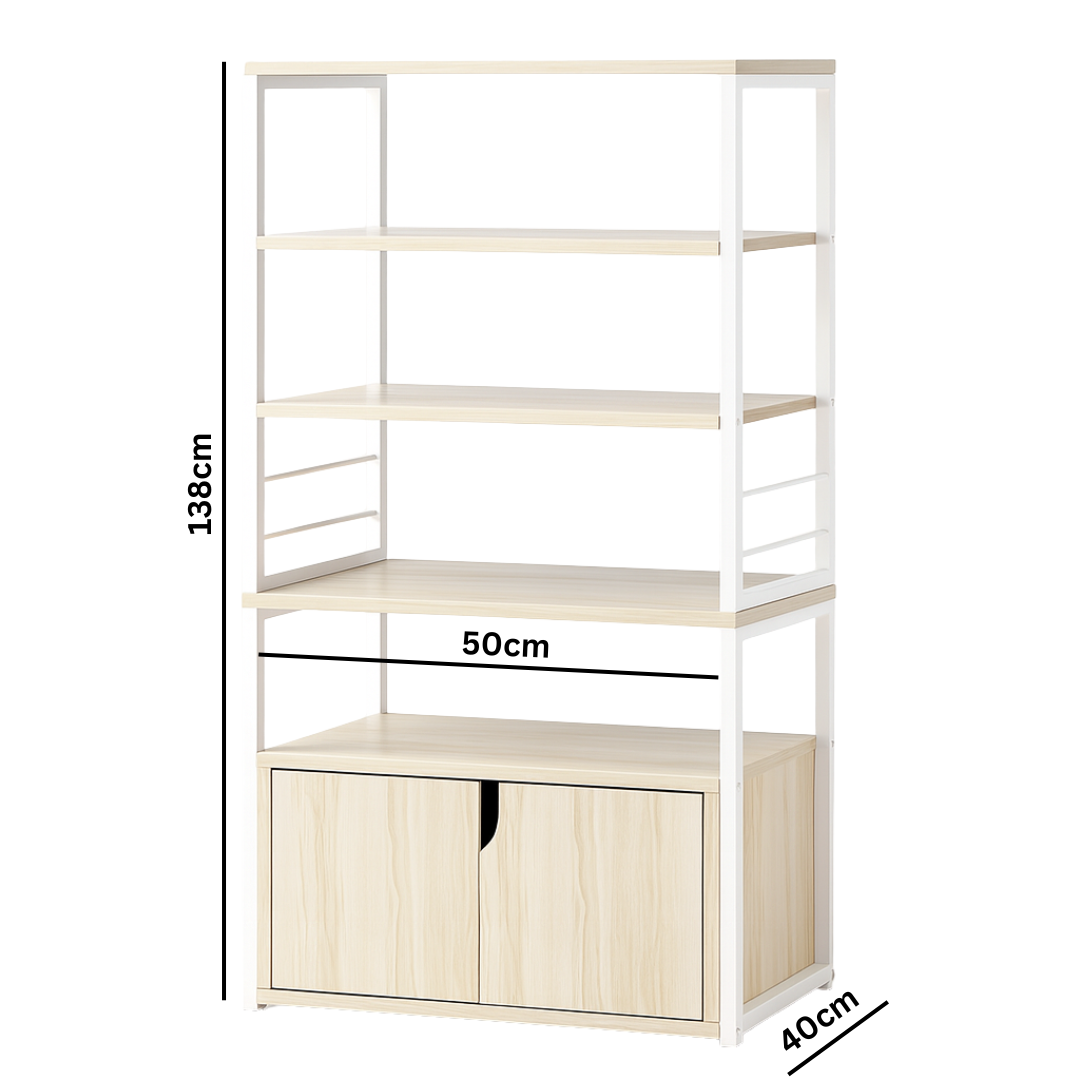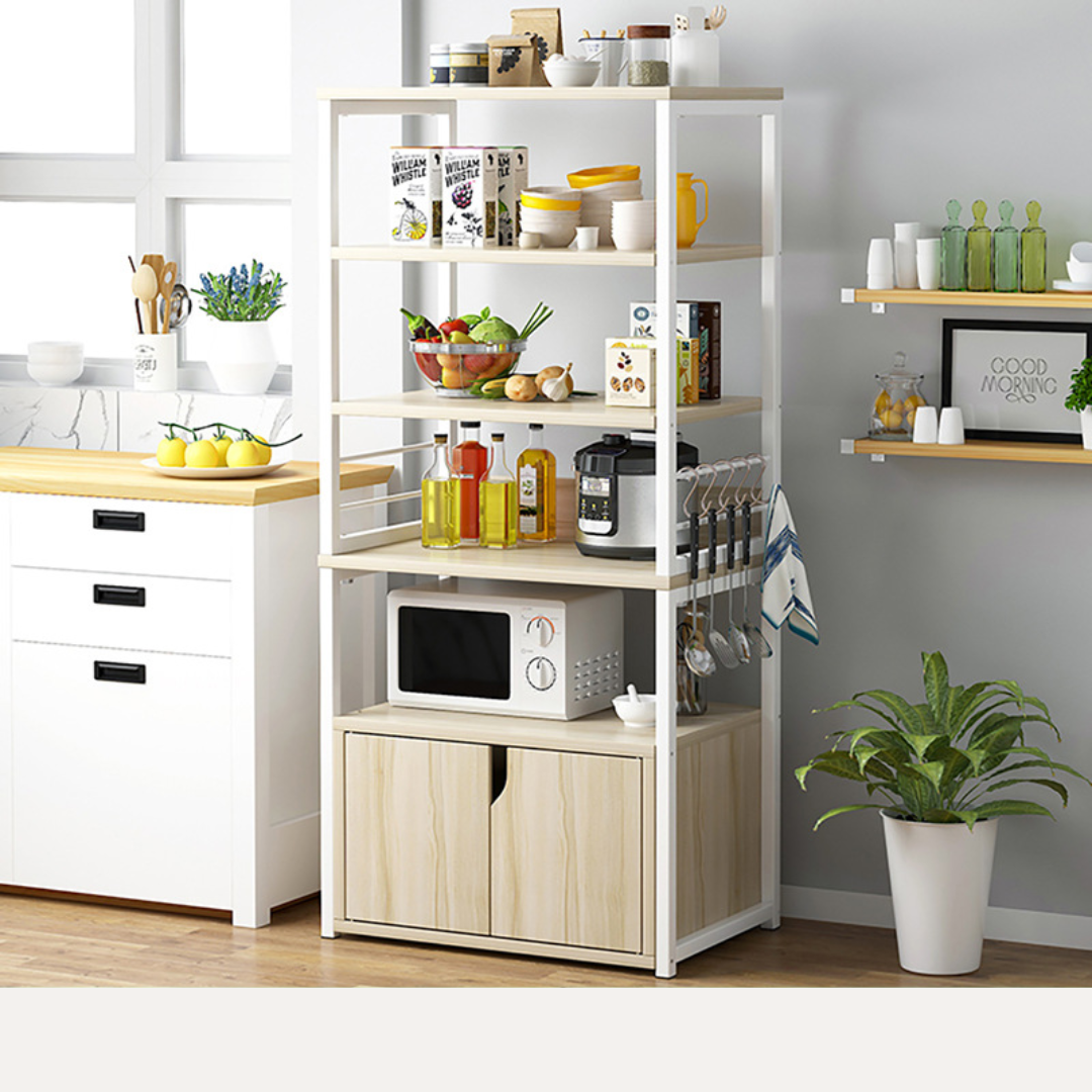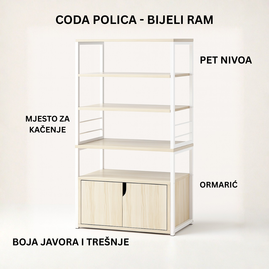 Sa pet prostranih nivoa, Coda polica nudi obilje prostora za sve vaše potrebe. Donji zatvoreni ormarić sa dvoja vrata savršen je za skladištenje namirnica, posuđa ili aparata koje želite sakriti od pogleda. Središnja polica je dovoljno prostrana da na nju smjestite mikrovalnu pećnicu, aparat za kafu ili blender, dok su gornje otvorene police idealne za začine, tegle ili ukrasne predmete.
