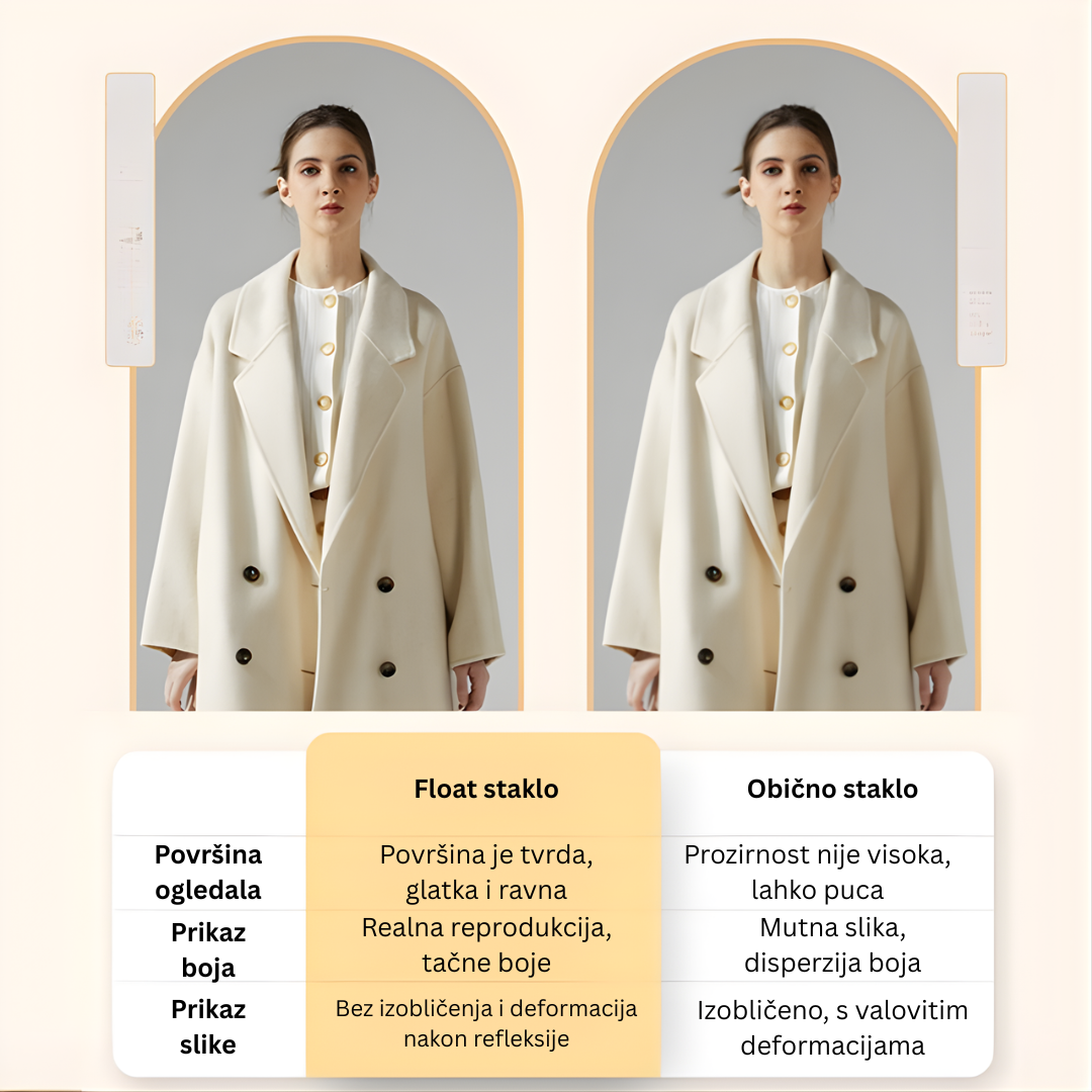 Vrhunsko Float Staklo: Za razliku od običnih ogledala, KYRO koristi specijalno float staklo koje pruža kristalno čistu sliku bez ikakvih izobličenja i nudi realnu reprodukciju boja.
