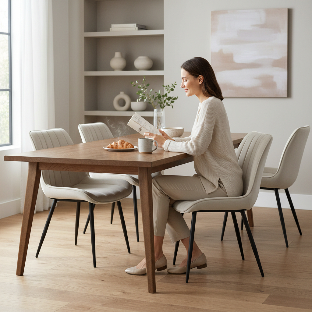 Prekrivena mehkim, visokokvalitetnim baršunom (velurom) sa vertikalnim štepovima, Repose stolica nudi sofisticiran izgled i nevjerovatnu mehkoću na dodir. Ergonomski zakrivljen naslon i sjedište punjeno pjenom visoke gustoće osiguravaju maksimalnu udobnost, čak i tokom dugih večera sa porodicom i prijateljima.