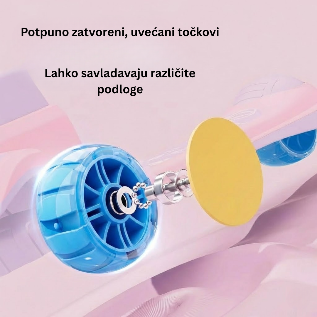 • Uvećani i zatvoreni točkovi: Široke gume omogućavaju lako savladavanje različitih podloga, dok potpuno zatvoreni dizajn štiti dječija stopala.