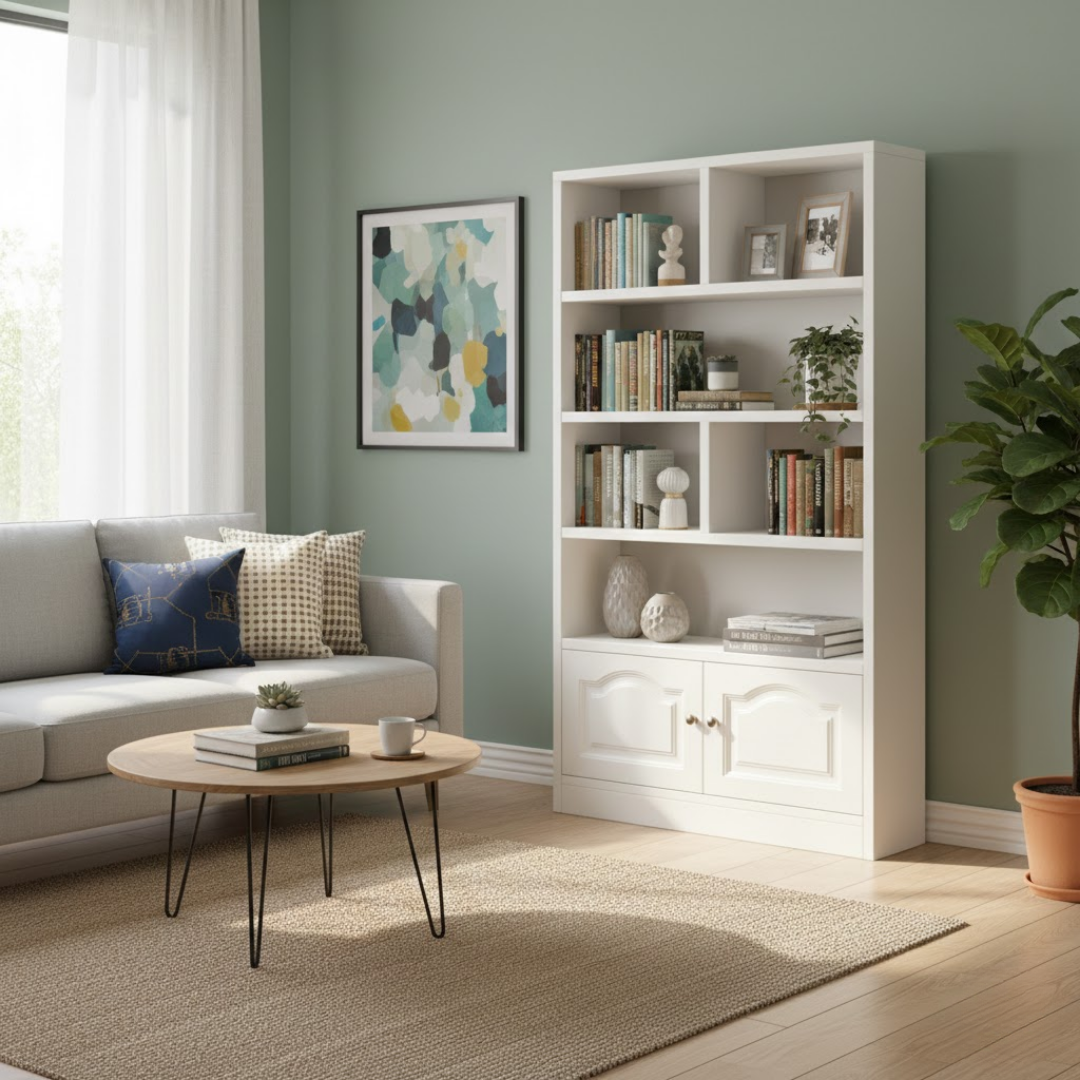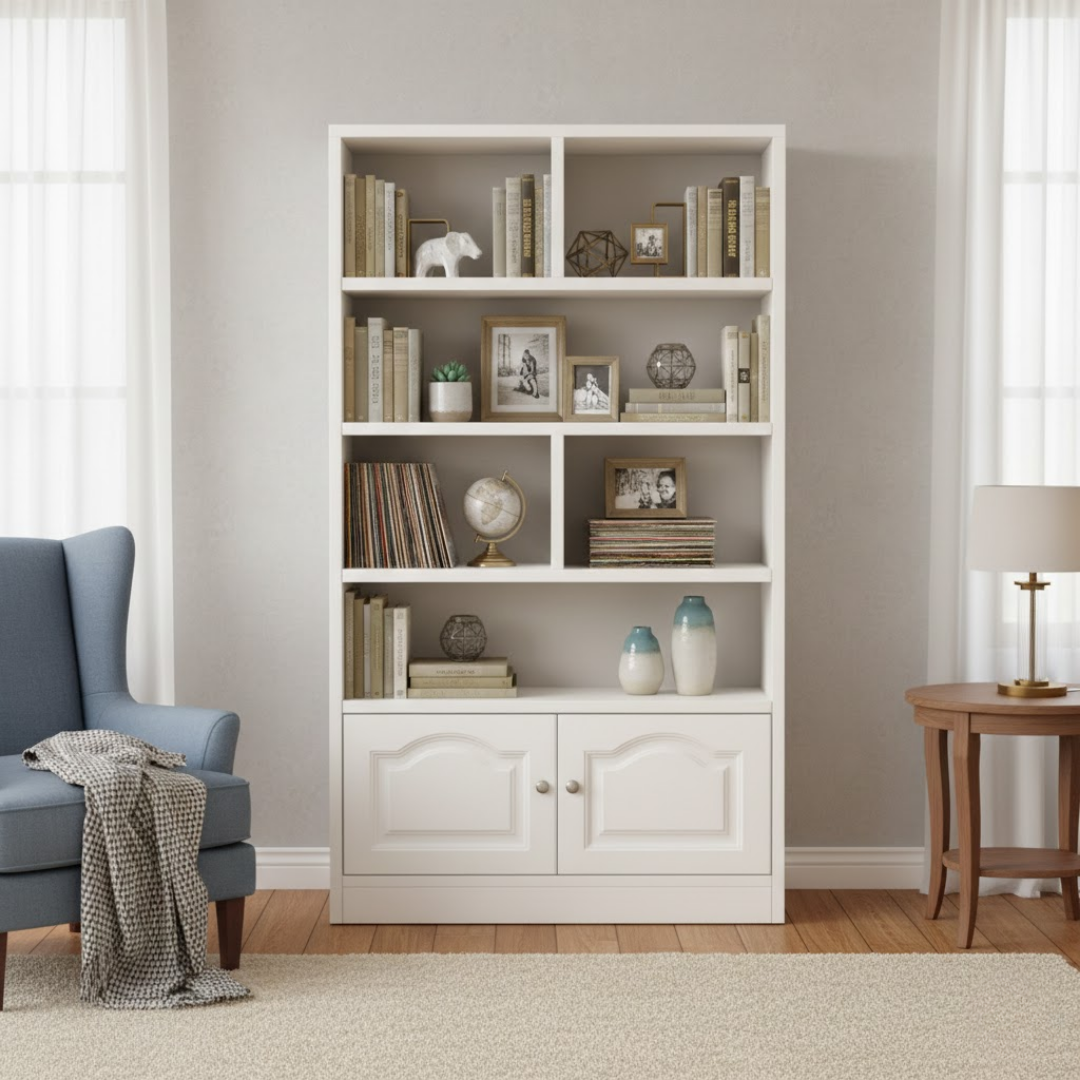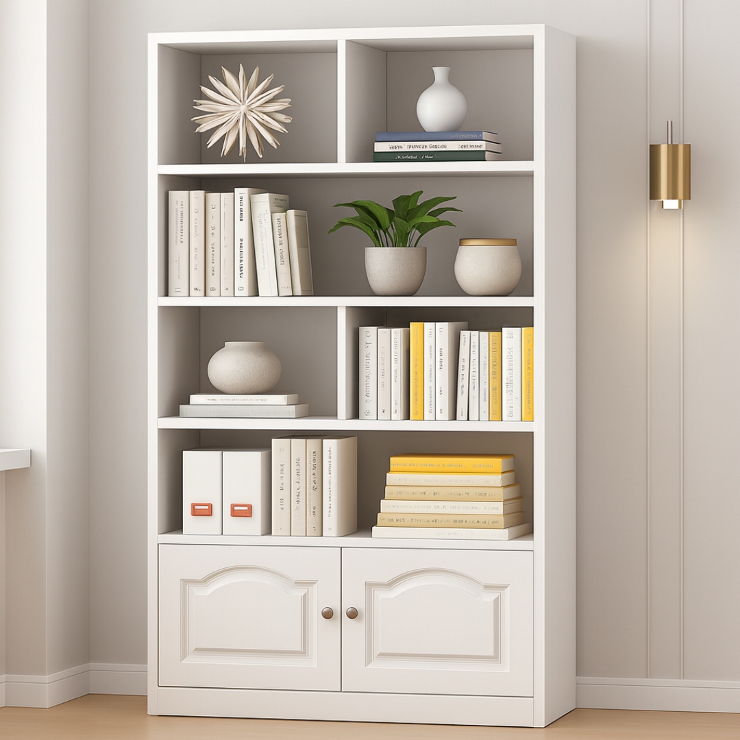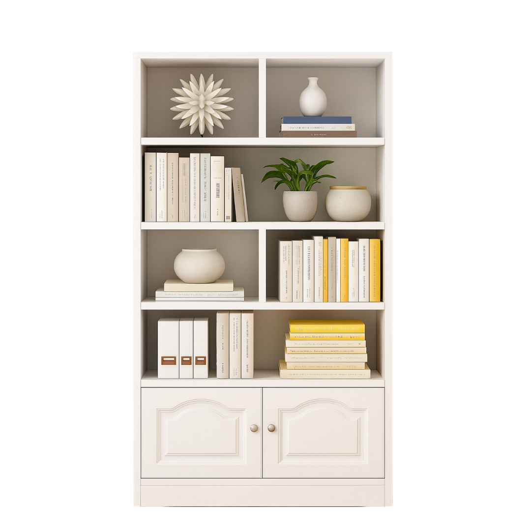 Višenamjenska struktura: Kombinacija asimetričnih otvorenih pregrada omogućava vam kreativnost u dekorisanju, dok donji ormarić s elegantnim vratima diskretno skriva stvari koje želite skloniti od pogleda.
