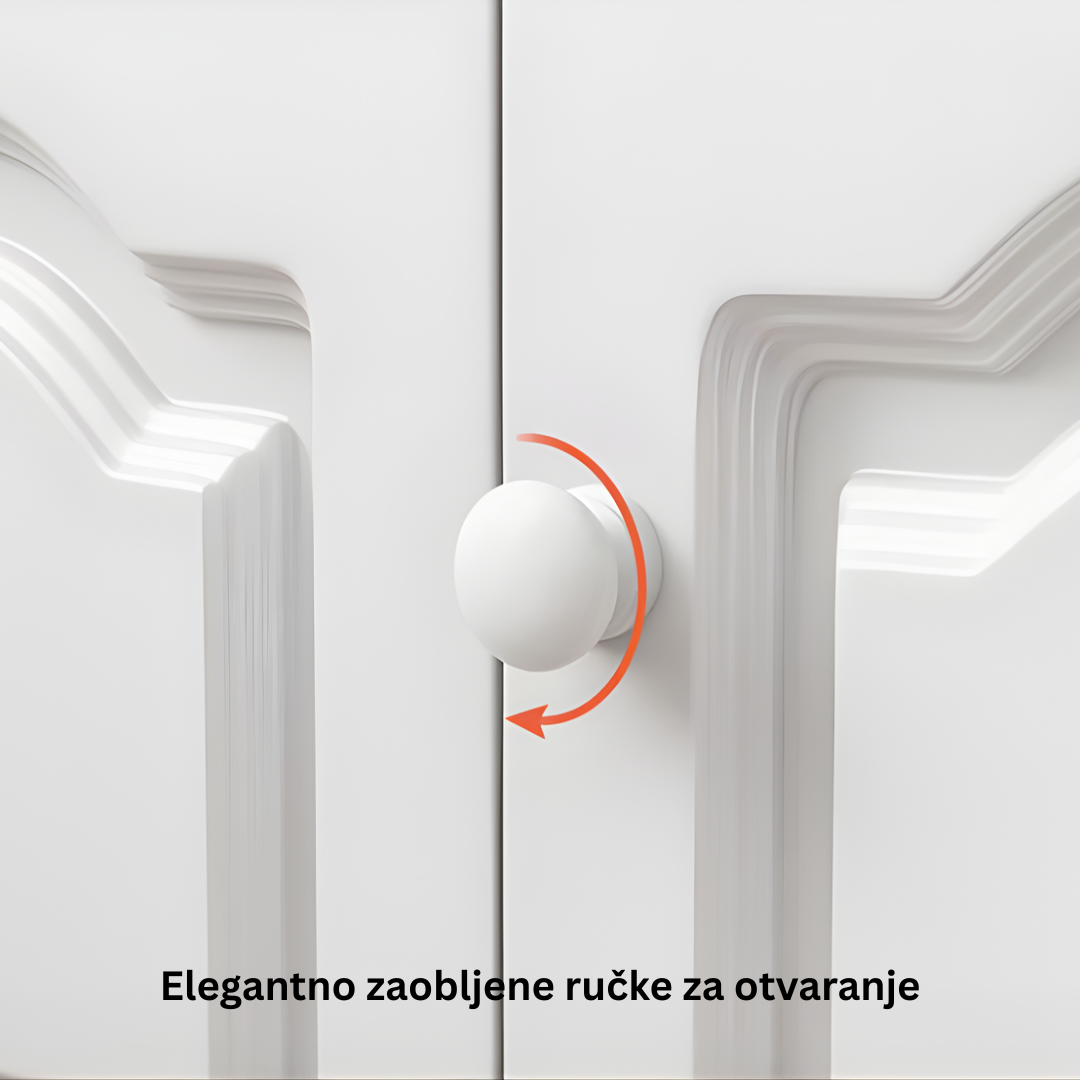 Moderan detalj: Arhaični lukovi na vratima ormarića u kombinaciji s minimalističkim ručkama daju joj unikatan, "neo-klasičan" izgled koji se uklapa u svaki enterijer.