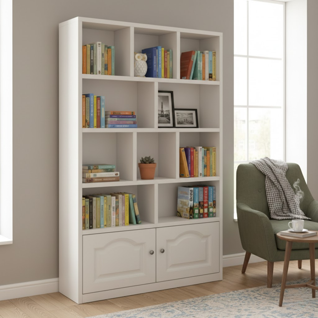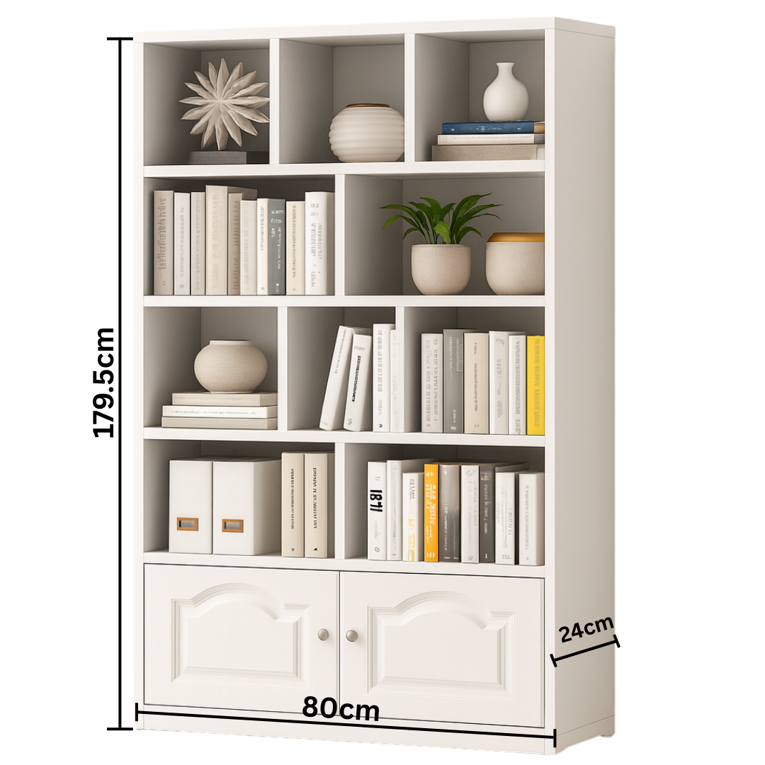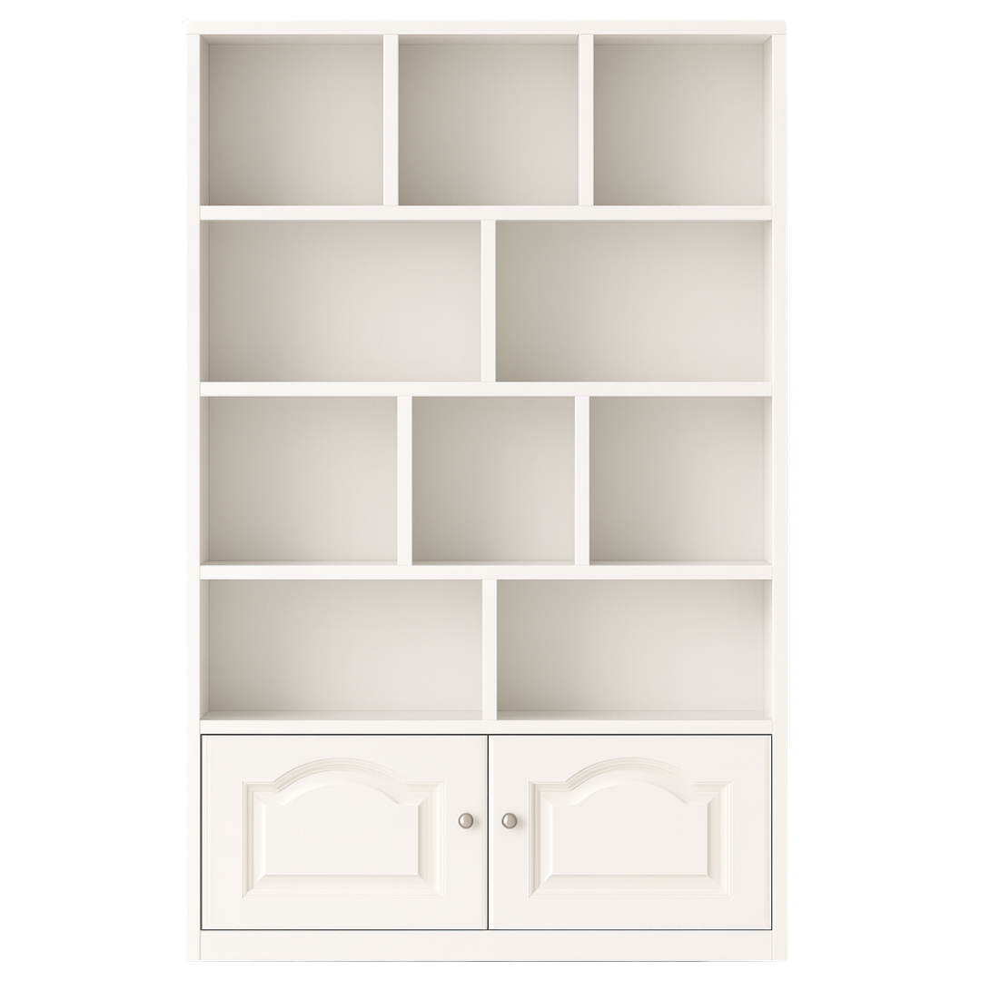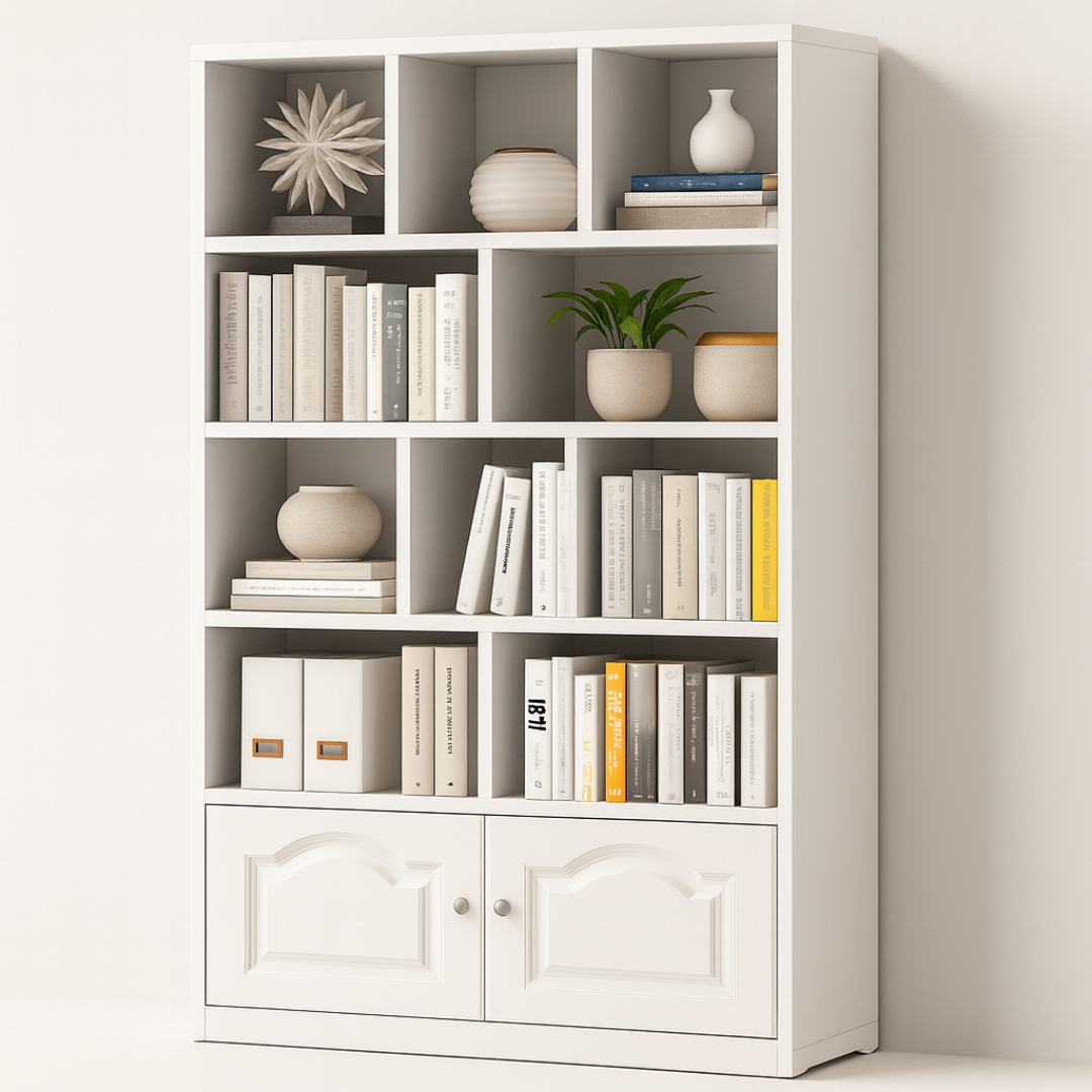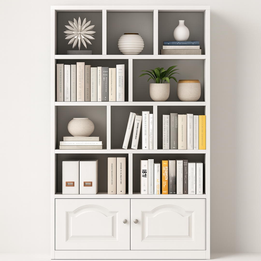 Višenamjenska struktura: Kombinacija asimetričnih otvorenih pregrada omogućava vam kreativnost u dekorisanju, dok donji ormarić s elegantnim vratima diskretno skriva stvari koje želite skloniti od pogleda.