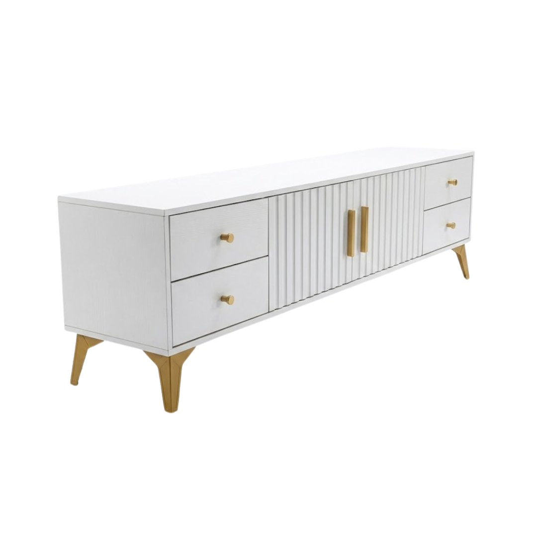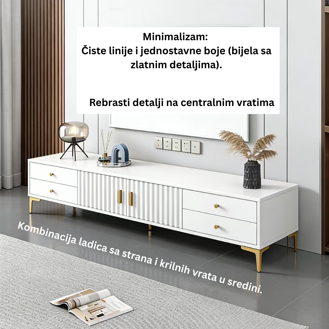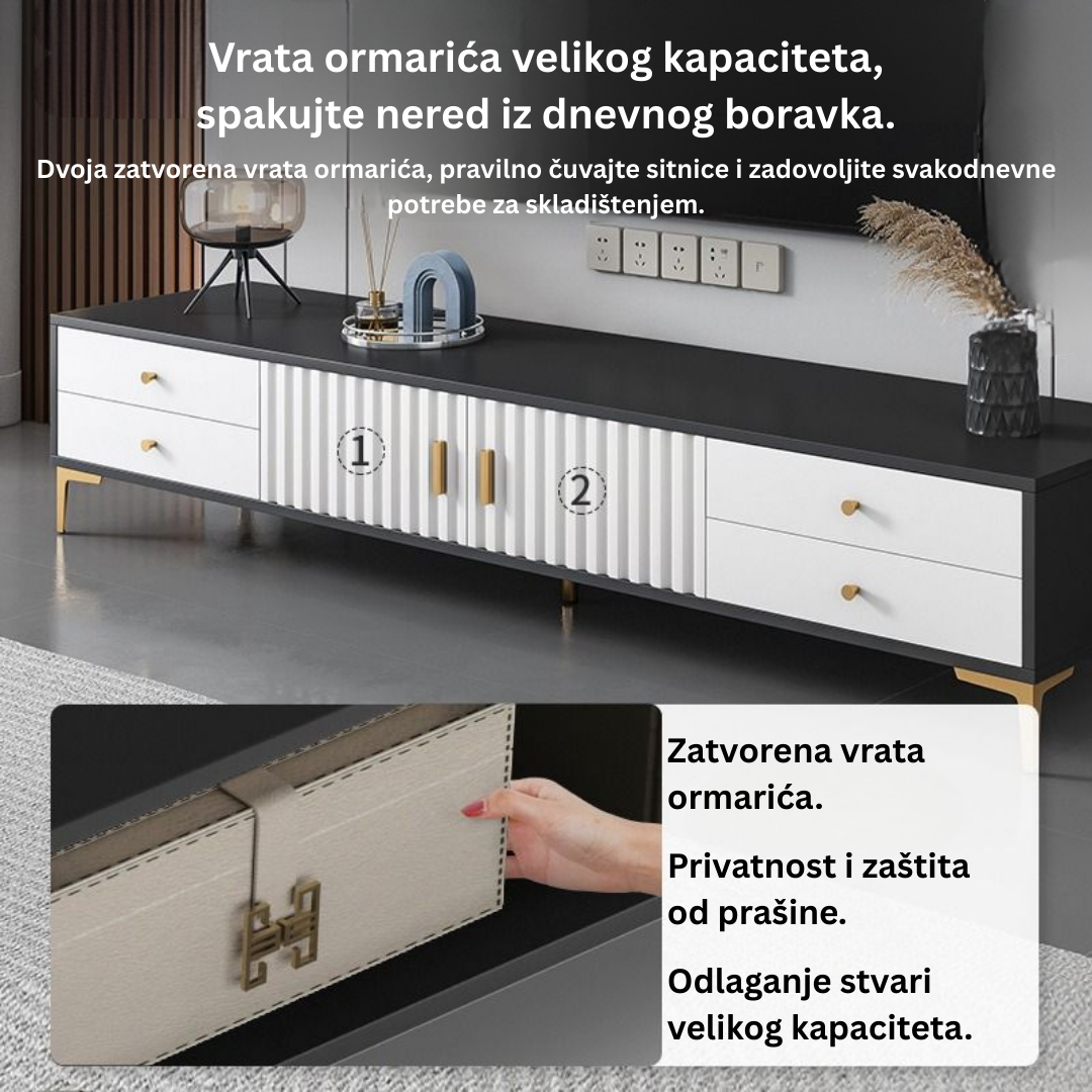 Unesite dašak luksuza i modernog minimalizma u svoj dom uz TV komodu Valente. Dizajnirana da spoji estetiku i maksimalnu funkcionalnost, ova komoda nije samo postolje za vaš TV, već centralni komad namještaja koji odiše stilom.