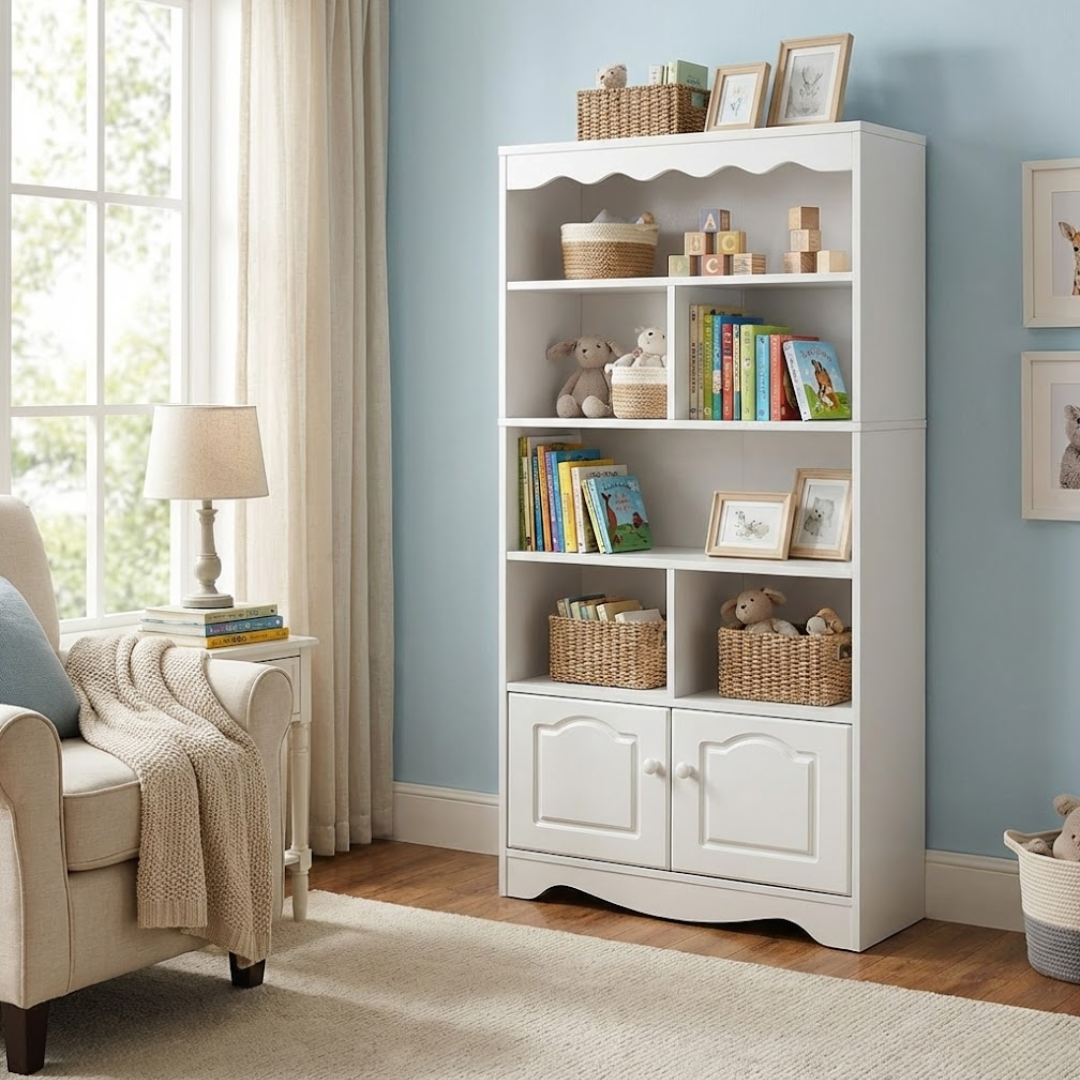 • Maksimalna iskoristivost prostora: Kombinacija otvorenih polica sa vertikalnim pregradama omogućava pregledno sortiranje slikovnica, fascikli ili ukrasa.