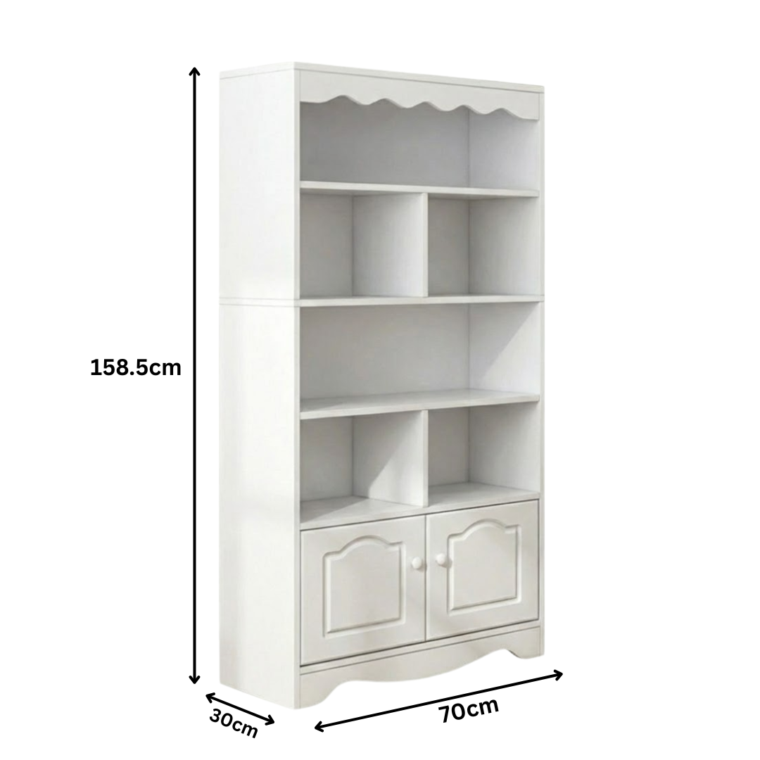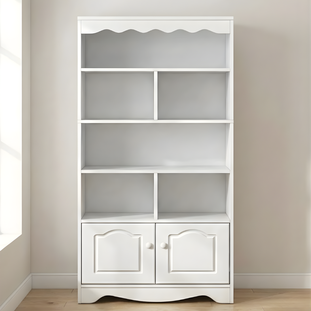 Prepoznatljiva po svojim nježnim valovitim detaljima na gornjoj ivici i bazi, polica Milori nudi bezvremensku estetiku koja se lako uklapa u različite stilove enterijera. Sa pet prostranih nivoa, ova polica Vam omogućava da izložite omiljene knjige i dekoracije, dok zatvoreni donji dio osigurava urednost i privatnost za stvari koje želite skloniti od pogleda.
