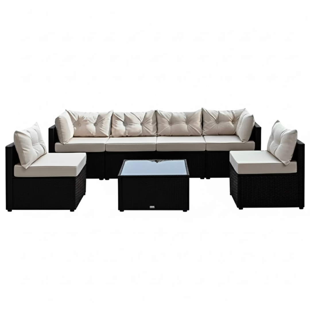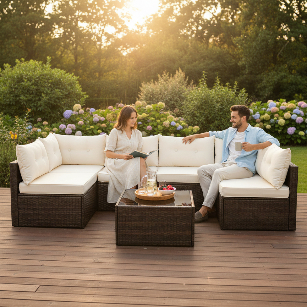 Izdržljivost: Konstrukcija od visokokvalitetnog PE ratana otporna je na vremenske uvjete, dok je staklena ploča stola kaljena za dodatnu sigurnost.