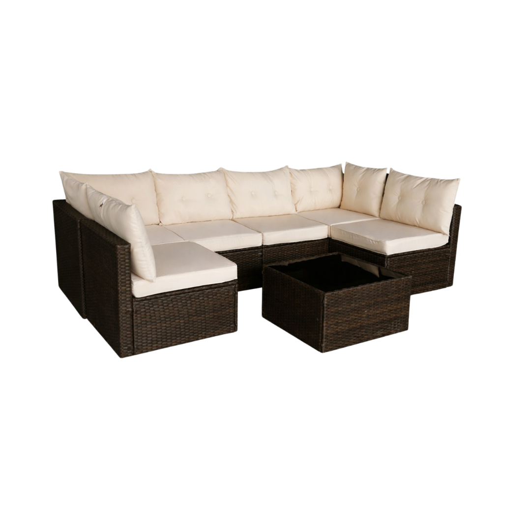 Izdržljivost: Konstrukcija od visokokvalitetnog PE ratana otporna je na vremenske uvjete, dok je staklena ploča stola kaljena za dodatnu sigurnost.