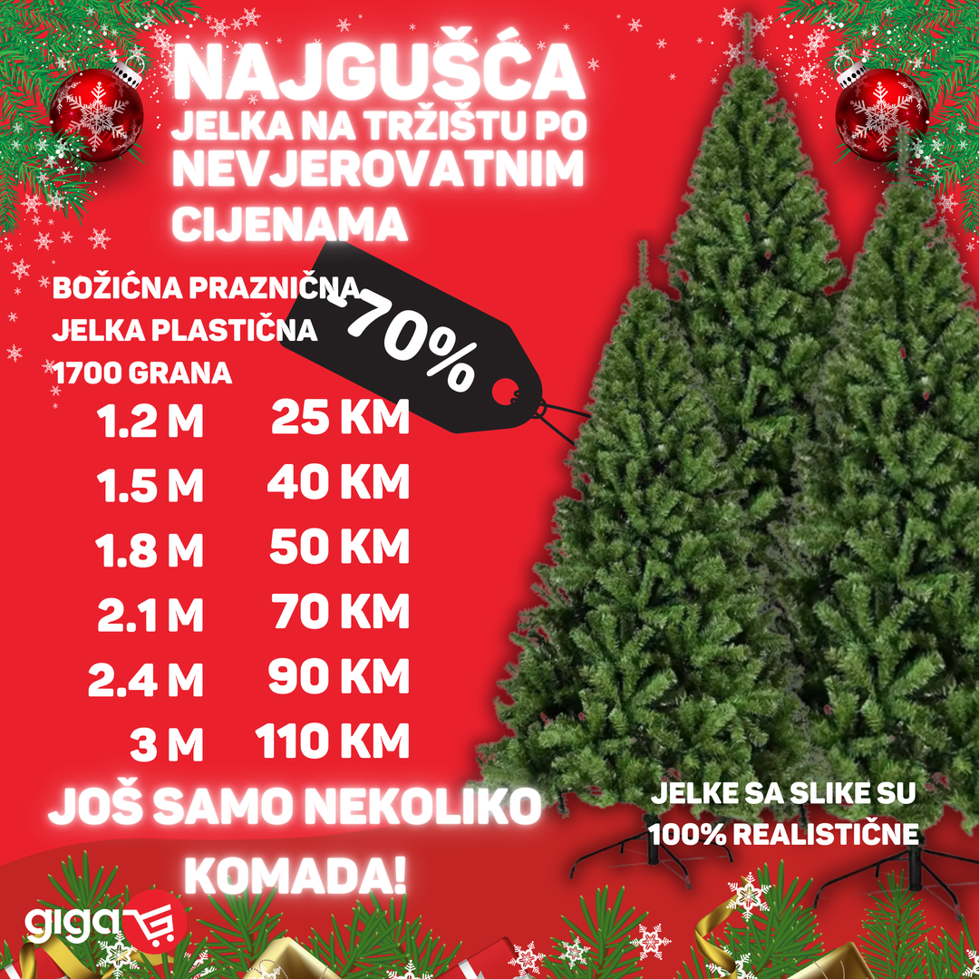 Osim toga, naše božićne jelke su jednostavne za postavljanje, čime vam štedimo dragocjeno vrijeme koje možete provesti s voljenima. Bez obzira tražite li klasičnu zelenu jelku, modernu bijelu jelku ili nešto sasvim drugačije, mi imamo sve što vam treba za stvaranje nezaboravnog božićnog iskustva.