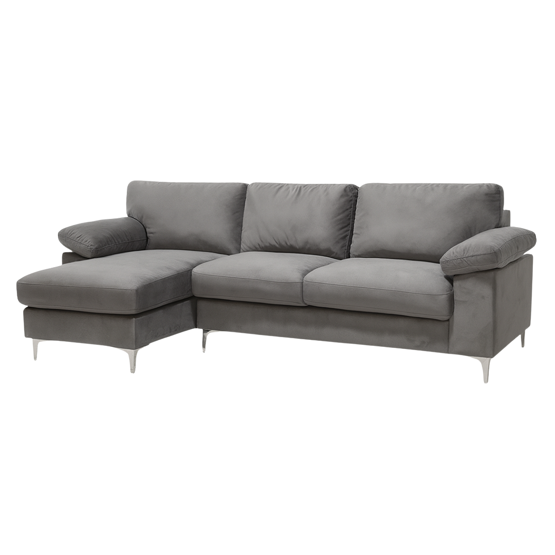 Unesite dozu luksuza i savremene udobnosti u svoj dnevni boravak s KAVEAH ugaonom garniturom – savršenim spojem modernog dizajna, funkcionalnosti i vrhunske izrade. Ova L-forma garnitura, presvučena u prefinjenu baršunastu tkaninu u elegantnoj sivoj boji, nudi ne samo estetiku već i maksimalnu udobnost za svakodnevni odmor i druženje.