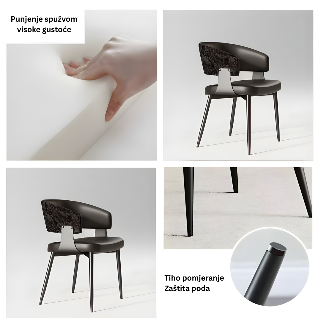 Naša stolica je dizajnirana da izdrži test vremena. Kontaktna površina je presvučena mikrofiber eko kožom koja ne samo da izgleda luksuzno, već je i nevjerovatno praktična. Fleksibilna je, čvrsta i otporna na svakodnevno korištenje, što je čini najboljim izborom u klasi. Konstrukcija od karbonskog čelika pruža izvanrednu stabilnost. Noge su obrađene posebnim procesom pečenog laka, što ih čini otpornim na habanje i ogrebotine, te osigurava da će izgledati kao nove i nakon duge upotrebe.