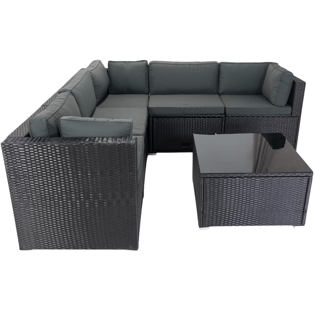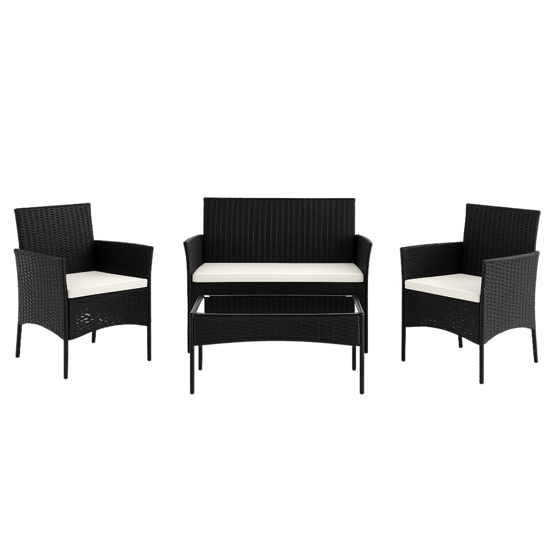 Izdržljivost: Konstrukcija od visokokvalitetnog PE ratana otporna je na vremenske uvjete, dok je staklena ploča stola kaljena za dodatnu sigurnost.